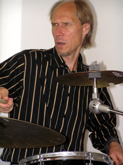 DAVID SUNDBY drums, is Norwegian and a multi-instrumentalist. David is a great creative musician whose playing is very spontanous. His is one of the most significant players of Scandinavia today, and his playing stretches all the way from total technical and theoretical control to completely free playing. He has been a member of Mwendo Dawa for a long time and has been touring internationally with the group and been very much contributing to the special sound of Mwendo Dawa. He came in his early 20th to Sweden, made his studies in Gothenburg and has since then played with a lot of both Swedish and Norwegian groups and musicians. He has been active in Norway playing at many of their Jazz festivals and performed with musicians like Philippe Catherine and George Garzone. He has also a dramatic side and is doing solo performances where his lively expression is deeply appreciated. |